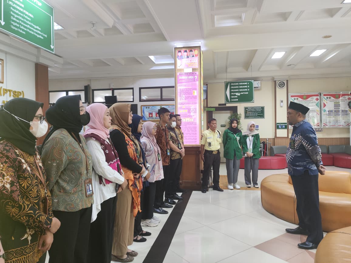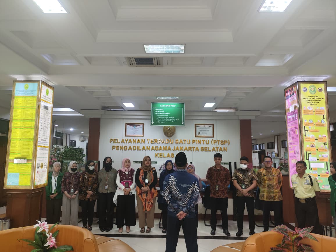 Panitera Pengadilan Agama Jakarta Selatan, Didin Jamaludin, S.H., M.H., memimpin kegiatan briefing pagi rutin bersama seluruh petugas pelayanan di ruang pelayanan terpadu satu pintu (PTSP).
