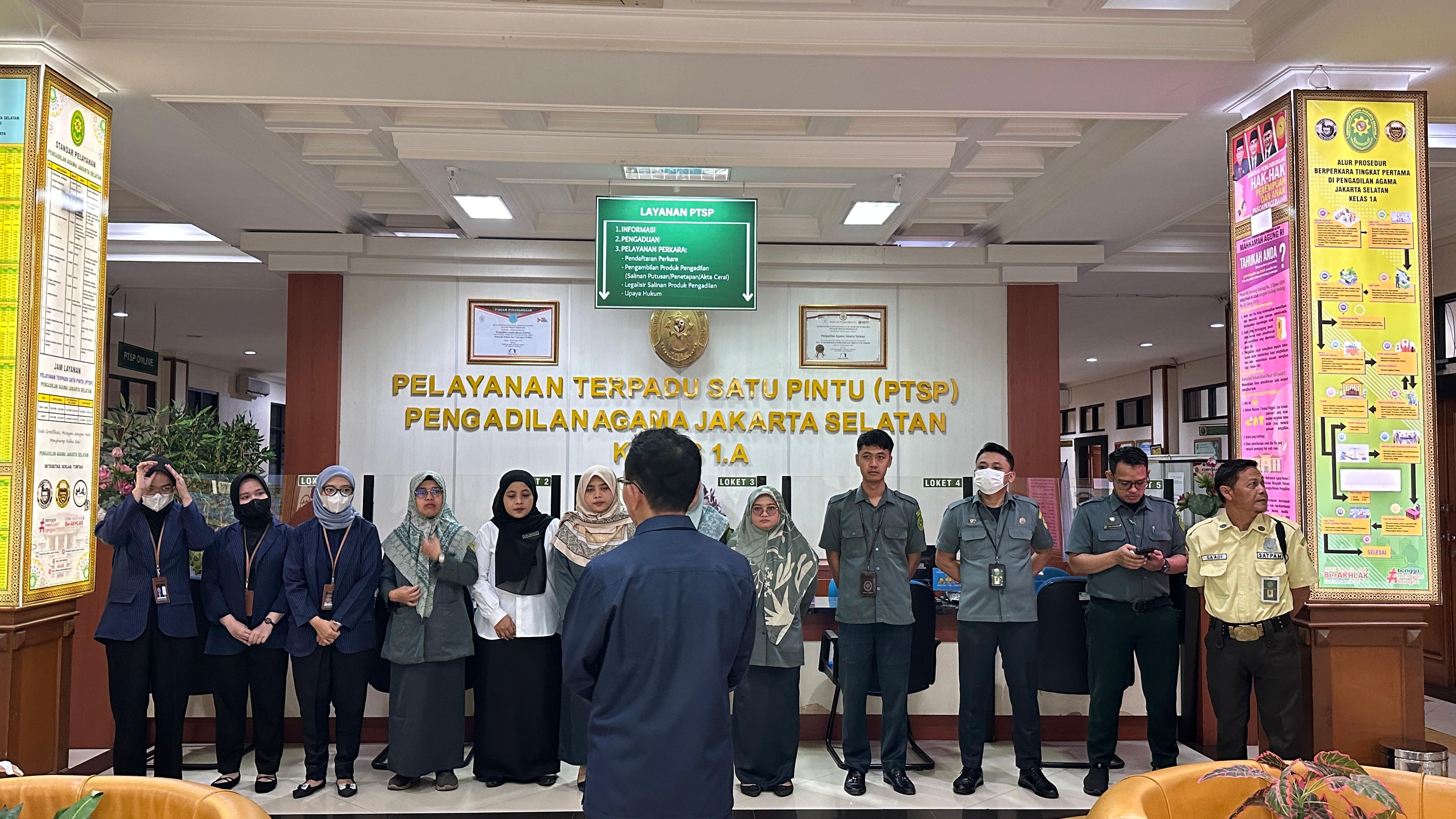 Ketua Pengadilan Agama Jakarta Selatan, Ruslan, S.Ag., S.H., M.H., memimpin langsung kegiatan briefing pagi untuk seluruh petugas Pelayanan Terpadu Satu Pintu (PTSP). Kegiatan ini diikuti dengan antusias oleh seluruh petugas yang hadir.