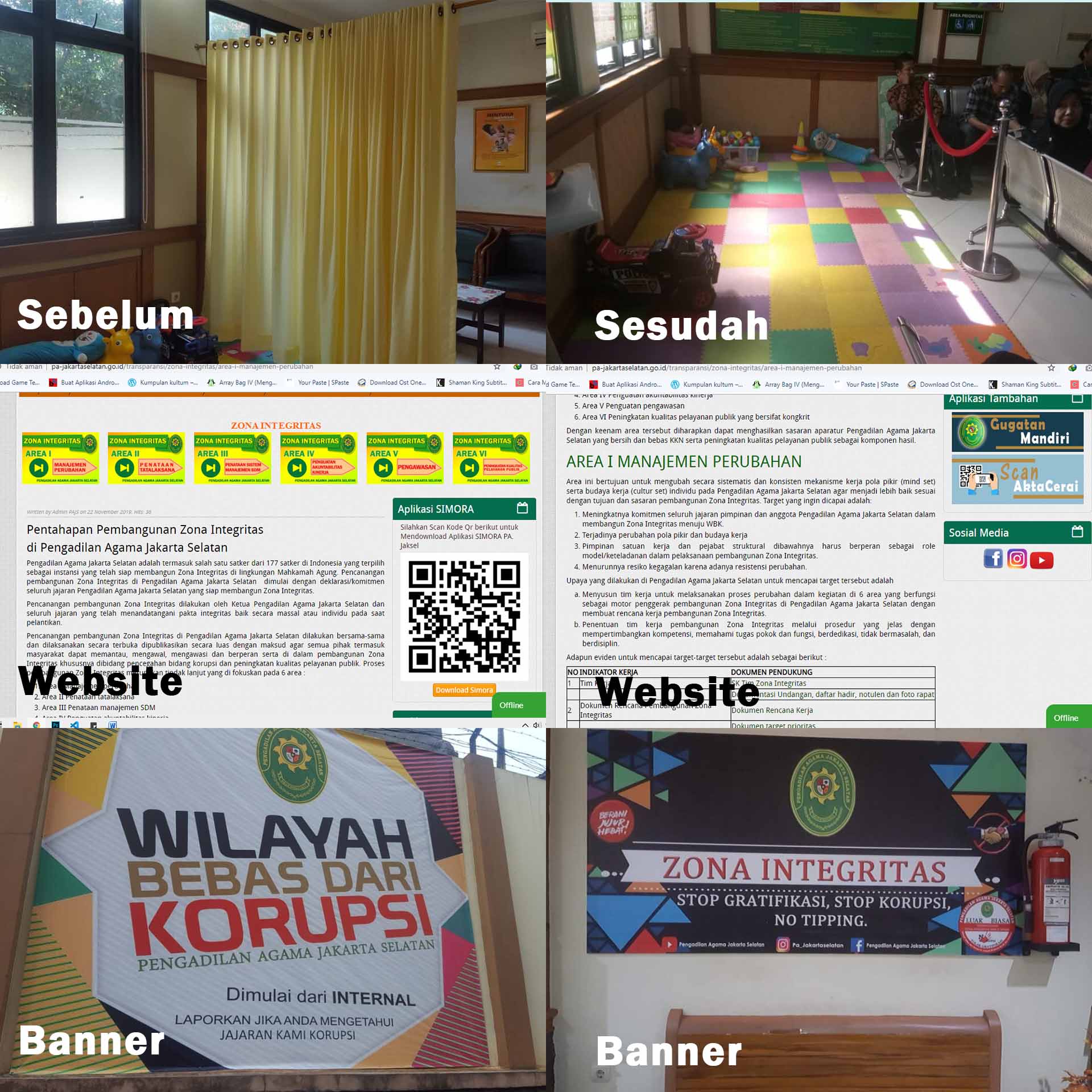 Ruang bermain anak akan lebih strategis jika posisinya bisa langsung melibatkan kesertaan orang tuanya dalam pengawasan di ruang tunggu. Agar memperbanyak public campaign di area/lingkungan Pengadilan Agama Jakarta Selatan Membuat narasi yang berkaitan dengan eviden 6 area pembangunan Zona Integritas yang telah dimuat di website. Atas arahan dan masukan tersebut sudah langsung di tindak lanjuti pada malam itu juga oleh Ketua Pengadilan Agama Jakarta Selatan dan jajarannya.