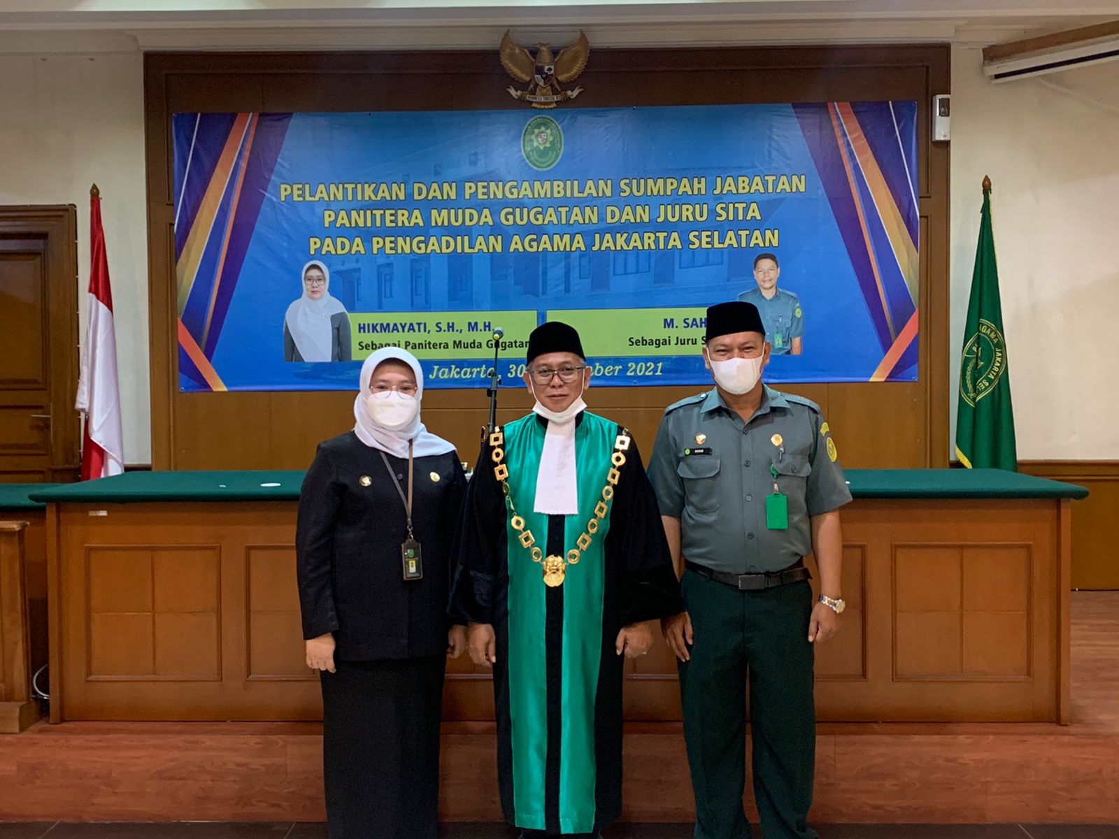 Bertempat di Ruang Sidang Utama, Pengadilan Agama Jakarta Selatan mengadakan Acara Pelantikan dan Sumpah Jabatan Panitera Muda Gugatan dan Jurusita Pengadilan Agama Jakarta Selatan. Bapak Drs. Ahmad Nur, M.H., selaku Pelaksana Tugas Ketua Pengadilan Agama Jakarta Selatan melantik Panitera Muda Gugatan yaitu Ibu Hikmayati, S.H., M.H., dari jabatan sebelumnya Panitera Pengganti dan Jurusita, Bapak M. Sahid dari jabatan sebelumnya Jurusita Pengganti. Diharapkan kedepannya para pegawai yang dilantik dapat mengemban amanah jabatan tersebut dan tetap menjaga nama baik Pengadilan Agama Jakarta Selatan.