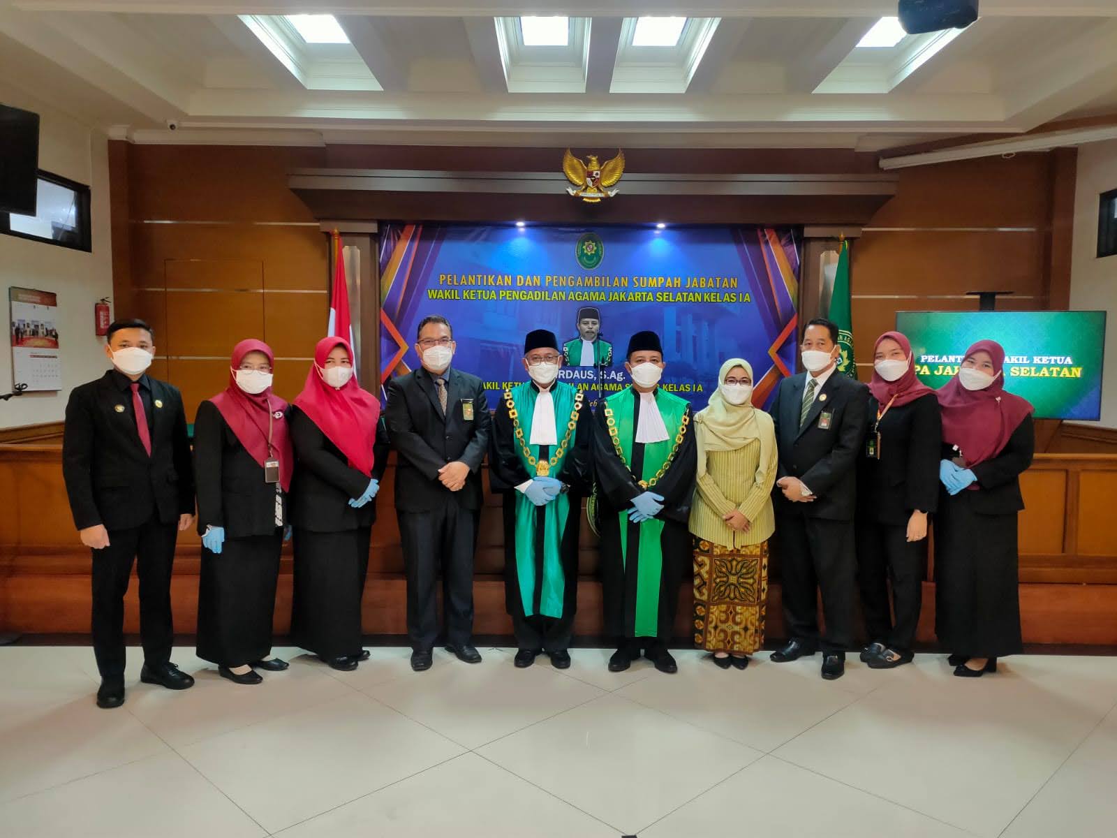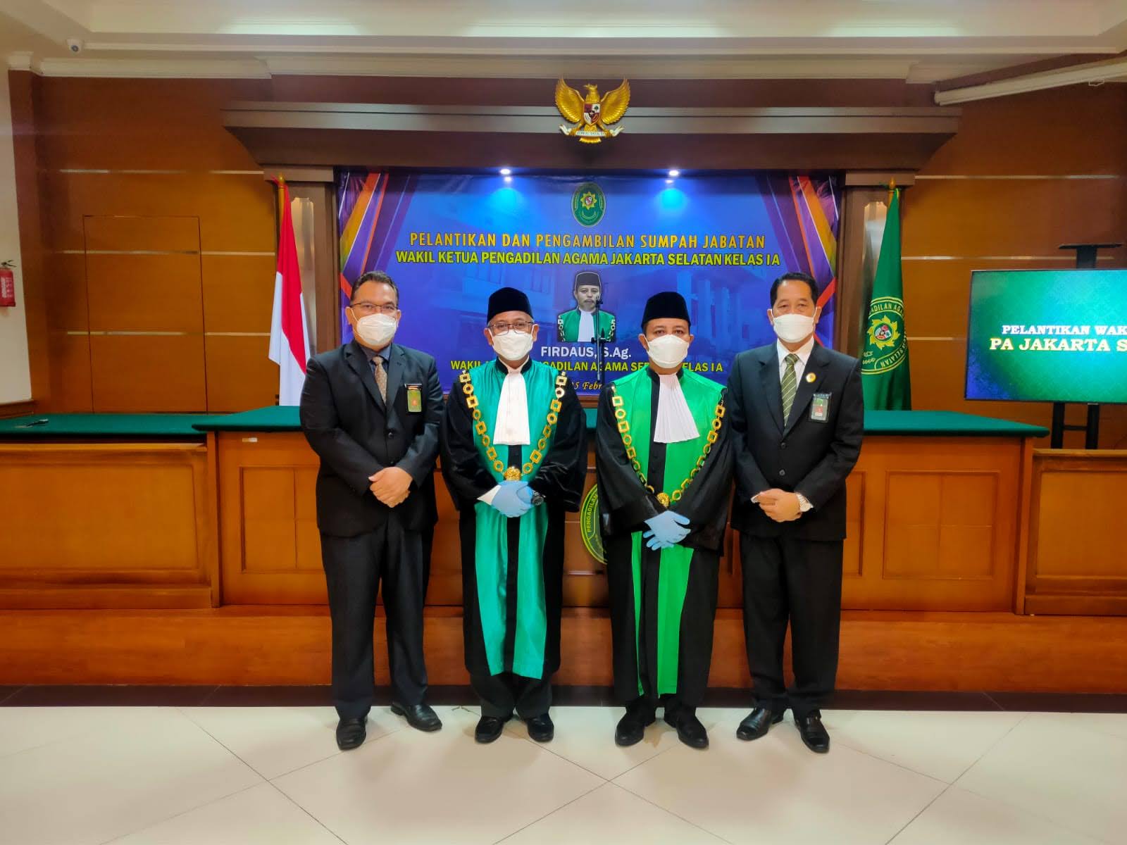 Ketua Pengadilan Agama Jakarta Selatan Drs. Ahmad Nur, M.H., dan segenap Pegawai Pengadilan Agama Jakarta Selatan mengucapkan selamat kepada Wakil Ketua Firdaus, S.Ag. dan Juru Sita yang baru dilantik. Dengan jabatan yang baru ini diharapkan agar dapat melaksanakan tugas dan tanggung jawab dengan sebaik-baiknya sesuai dengan undang-undang dan peraturan yang berlaku dan selalu memegang sumpah jabatan yang telah diikrarkan. Semoga jabatan yang baru diberikan ini membawa berkah bagi pemegang jabatan yang baru dan keluarga besar Pengadilan Agama Jakarta Selatan.