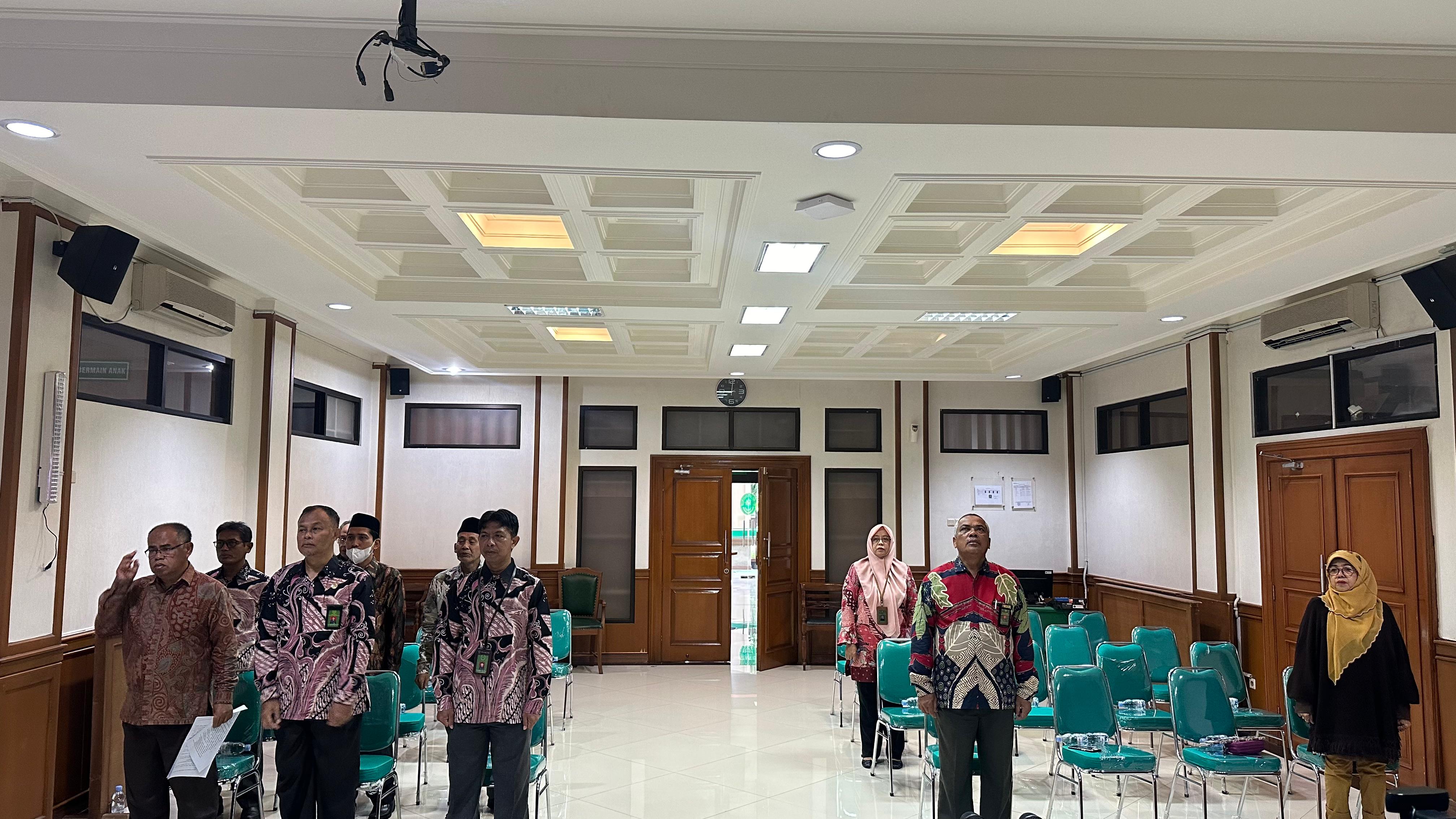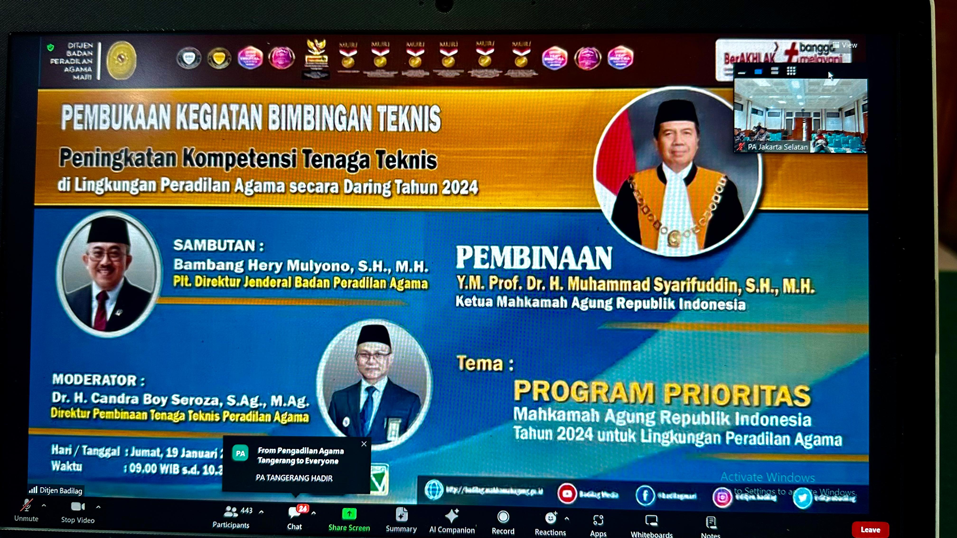 Jakarta Selatan (Jumat, 19 Januari 2024) – Pengadilan Agama Jakarta Selatan mengikuti Pembukaan Kegiatan Bimbingan Teknis dan Pembinaan Yang Mulia Ketua Mahkamah Agung RI Prof Dr. H. M. Syarifuddin, S.H., M.H. di Lingkungan Peradilan Agama secara daring tahun 2024 dengan tema "Program Prioritas Mahkamah Agung RI untuk Lingkungan Peradilan Agama Tahun 2024". Pembinaan dihadiri oleh Ketua PA Jakarta Selatan Dr. H. Muslikin, M.H., Wakil Ketua, Hakim, Panitera dan Sekretaris.