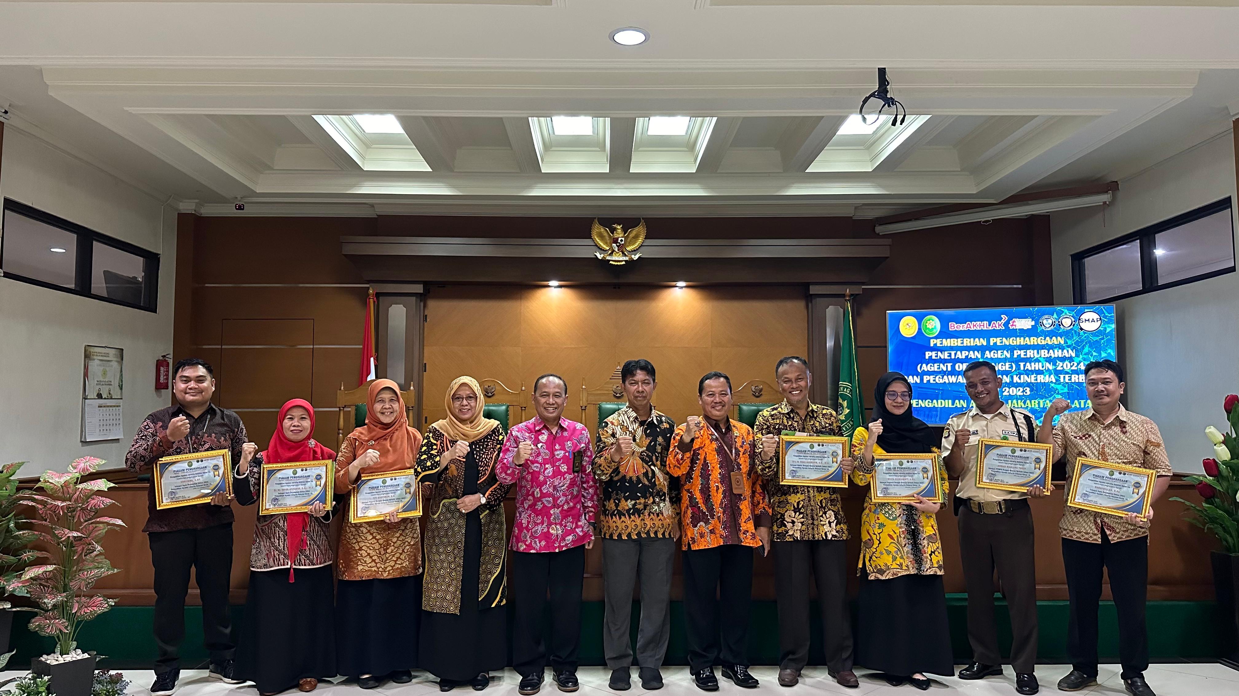 Jakarta Selatan (Kamis, 18 Januari 2024)- Bertempat di Ruang Sidang Utama Pengadilan Agama Jakarta Selatan, dilaksanakan pemberian penghargaan kepada Agen Perubahan Tahun 2024 dan Pegawai dengan kinerja terbaik Tahun 2023. Agen perubahan Pengadilan Agama Jakarta Selatan tahun 2024 : 1. Dr. Hj. Yayuk Afiyanah, S.Ag., M.A. (Hakim) 2. Oebaydillah, S.Ag. (Kepaniteran) 3. Sopiyana, S.AP. (Kesekretariatan). Pegawai dengan kinerja terbaik Tahun 2023 : 1. Drs. H. Enas Nasrudin, S.H., M.H. (Hakim) 2. Milta Desniawaty, A.Md. (Kepaniteraan) 3. Titi Khotimah, S.H. (Kesekretariatan) 4. Ahmad Maulana Yusuf ( PPNPN). Dalam sambutannya Ketua Pengadilan Agama Jakarta Selatan Dr. H. Muslikin, M.H. menyampaikan “Penghargaan yang diberikan bukan sekadar simbol apresiasi, tetapi juga representasi dari nilai-nilai integritas, dedikasi, dan inovasi. Pegawai yang kita apresiasi hari ini telah menunjukkan integritas dan dedikasi dalam menjalankan tugas dengan hati yang penuh kepedulian. Penetapan beberapa di antara kita sebagai agen perubahan adalah langkah strategis dalam merespons dinamika zaman. Prestasi para penerima penghargaan adalah cerminan dari komitmen dan kerja keras. Semoga menjadi motivasi bagi kita semua.”