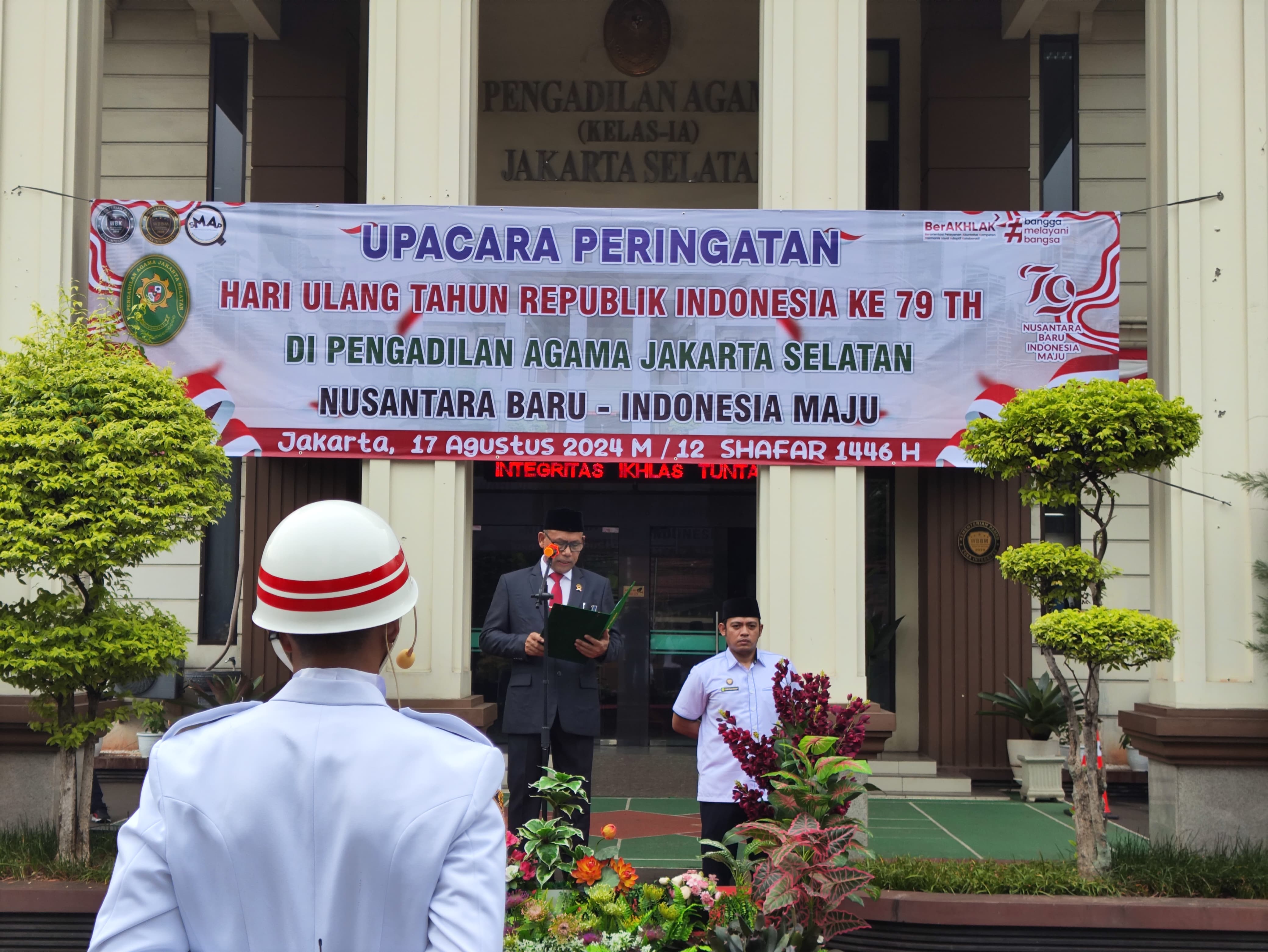 Jakarta Selatan - Senin, 17 Agustus 2024 Pengadilan Agama Jakarta Selatan Melaksanakan Upacara Pengibaran Bendera Sang Merah Putih dalam rangka peringatan HUT RI ke-79 Kemerdekaan Republik Indonesia Tema peringatan Hari Ulang Tahun Ke-79 Kemerdekaan RI Tahun 2024 adalah “Nusantara Baru Indonesia Maju”. Seluruh aparatur Pengadilan Agama Jakarta Selatan yaitu para Hakim, Pejabat Struktural dan Fungsional serta PPNPN mengikuti upacara pengibaran bendera merah putih yang berlangsung di halaman kantor Pengadilan Agama Jakarta Selatan. Pada kegiatan Upacara Bendera, bertindak selaku Pembina adalah Ketua Pengadilan Agama Jakarta Selatan Drs. H. Juwaini. S.H,. M.H. Selanjutnya, Pemberian penghargaan Lencana Penghargaan kepada Pegawai Pengadilan Agama Jakarta Selatan atas Satyalancana Karya Satya 20 Tahun & Satyalancana Karya Satya 30 Tahun pengabdian oleh Ketua didampingi oleh Wakil Ketua PA Jakarta Selatan “SELAMAT MEMPERINGATI HARI KEMERDEKAAN REPUBLIK INDONESIA YANG KE-79” “Momen untuk mengenang perjuangan danmerayakan kemerdekaan dengan penuh rasa syukur” - PAJS Integritas Ikhlas Tuntas -