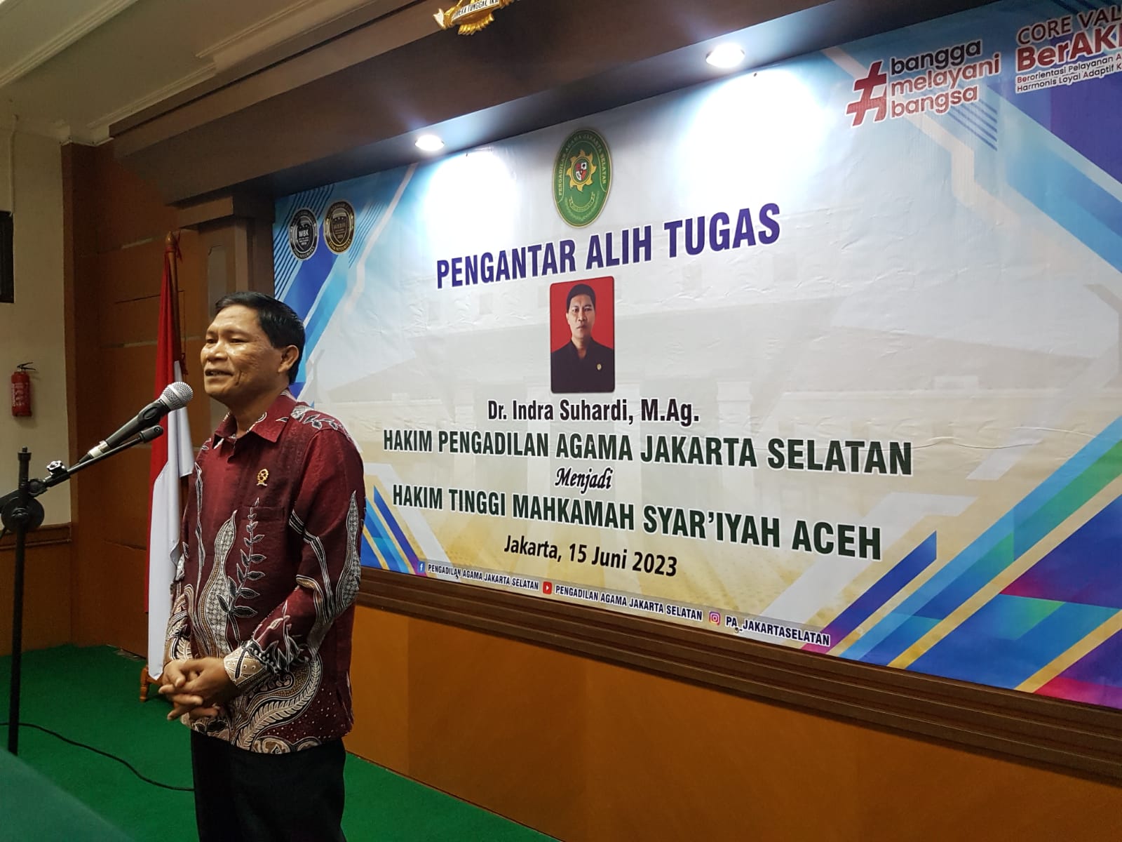 Acara diawali dengan kesan dan pesan dari Dr. Indra Suhardi, M.Ag. yang telah mendapatkan promosi sebagai Hakim Tinggi Mahkamah Syar’iyah Aceh. Kemudian dilanjutkan dengan sambutan oleh Ketua Pengadilan Agama Jakarta Selatan, Dr. H. Muslikin,M.H., untuk memberikan ucapan selamat menjalankan tugas ditempat yang baru kepada Dr. Indra Suhardi, M.Ag.