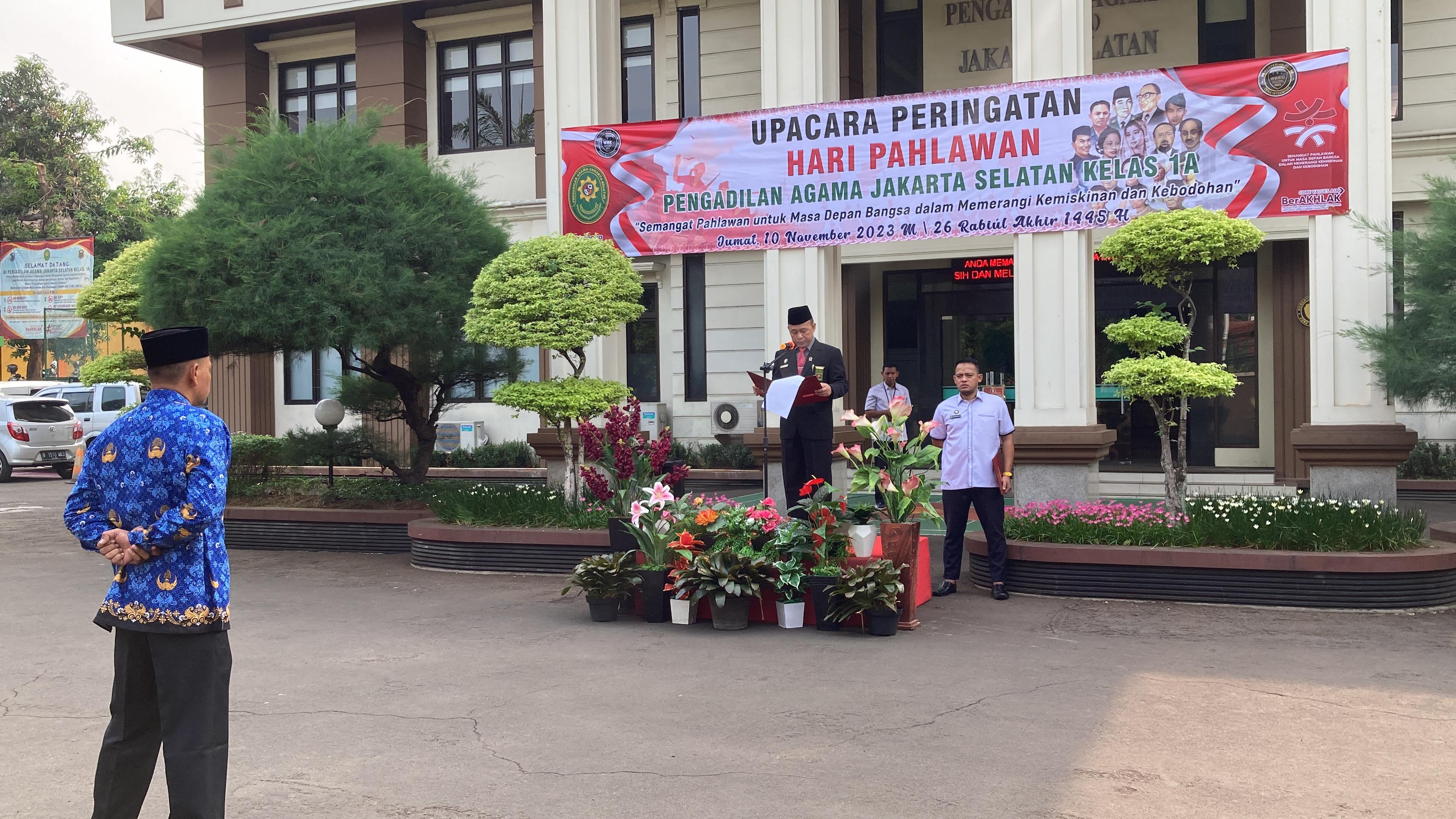Selamat Hari Pahlawan tahun 2023. Marilah kita panjatkan doa bagi para pahlawan yang telah gugur mendahului kita.” kata Menteri Sosial RI Tri Rismaharini dalam Pidatonya yang dibacakan oleh Ketua Pengadilan Agama Jakarta Selatan Dr. H. Muslikin, M.H.