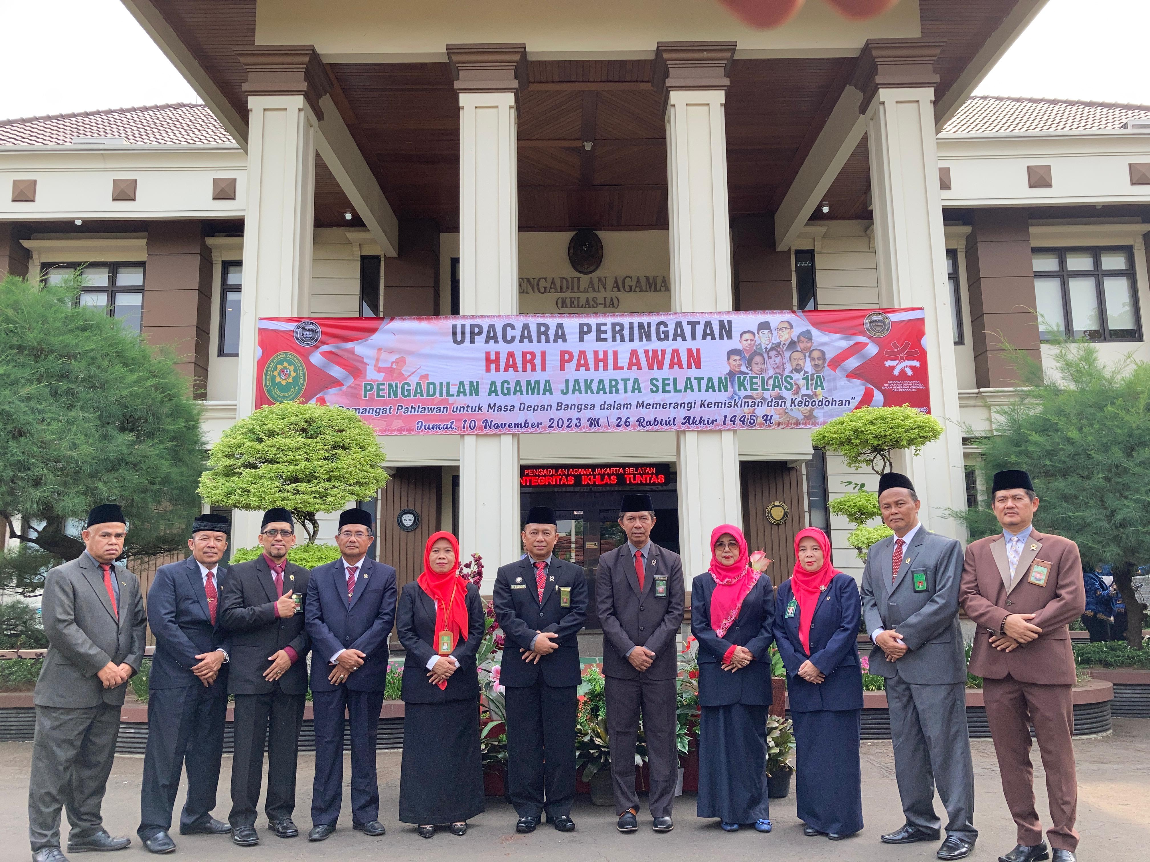 Bertempat di halaman Pengadilan Agama Jakarta Selatan dilaksanakan upacara Peringatan Hari Pahlawan yang ke-78 tahun dengan tema “Semangat Pahlawan Untuk Masa Depan Bangsa Dalam Memerangi Kemiskinan dan Kebodohan”. Upacara dimulai pukul 08.00 WIB dan diikuti oleh Ketua, Wakil Ketua, Hakim, Panitera, Sekretaris, Panitera Pengganti, Juru Sita, CPNS, dan PPNPN. Dalam pelaksanaan upacara tersebut yang bertindak selaku Pembina Upacara adalah Ketua Pengadilan Agama Jakarta Selatan Dr. H. Muslikin, M.H.